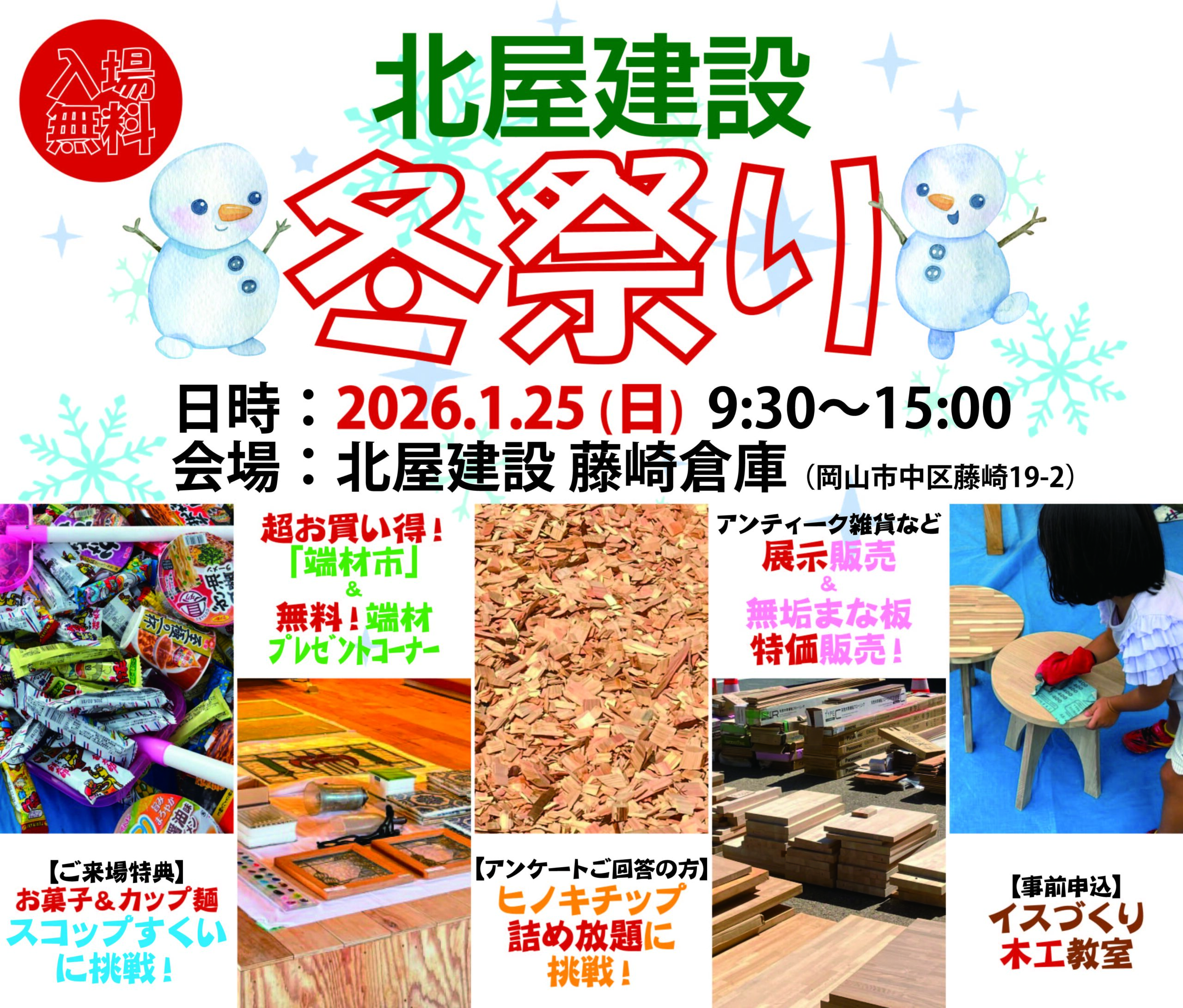 開催日: 2026年1月25日(日) 時 間: 9:30~15:00 場 所: 北屋建設 藤崎倉庫(岡山市中区藤崎19-2) 駐車場:現地にてご案内します -