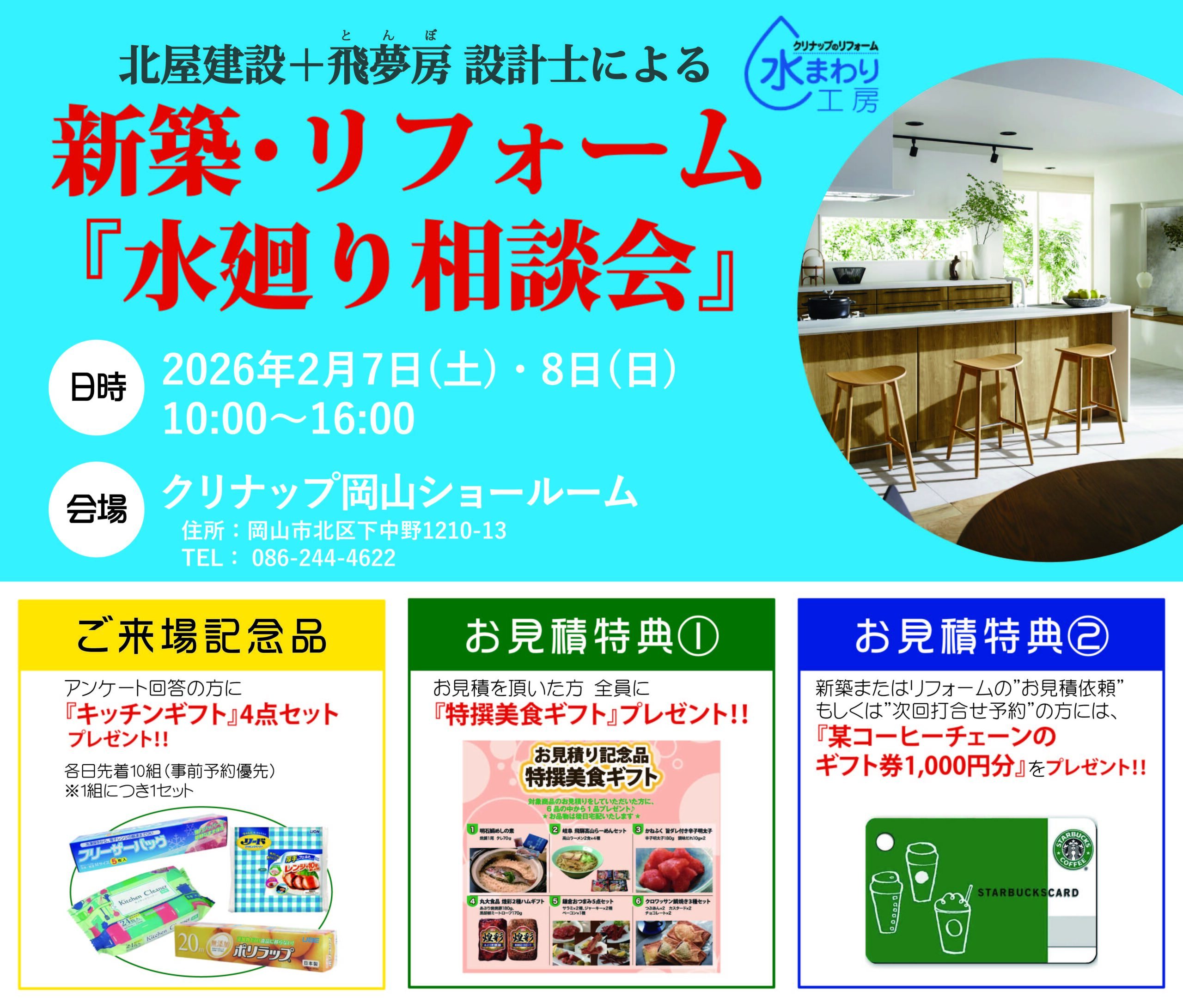 北屋建設+飛夢房 設計士による 新築・リフォーム『水廻り相談会』inクリナップ岡山ショールーム